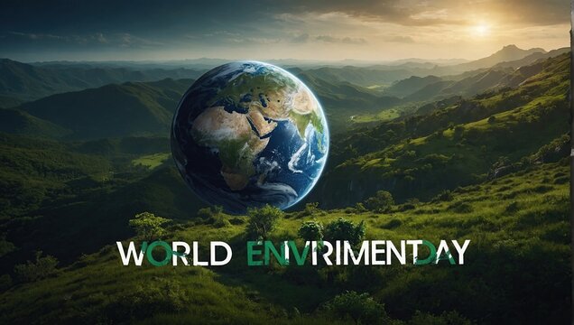 World environment day text with a full view of planet earth and nature landscape creative concept image manipulation environment day, earth day, global warming day