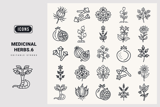 Medicinal herbs icon set. Black Seed Nigella, Clove, Pomegranate, Agrimony, marsh mallow plant, Lady’s Mantle, Bullwort, Visnaga, Birthwort, American Arnica, silhouette icons.