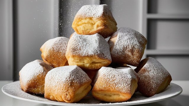 Classic New Orleans beignets, covered in powdered sugar, are a traditional American treat, shown against a white backdrop.