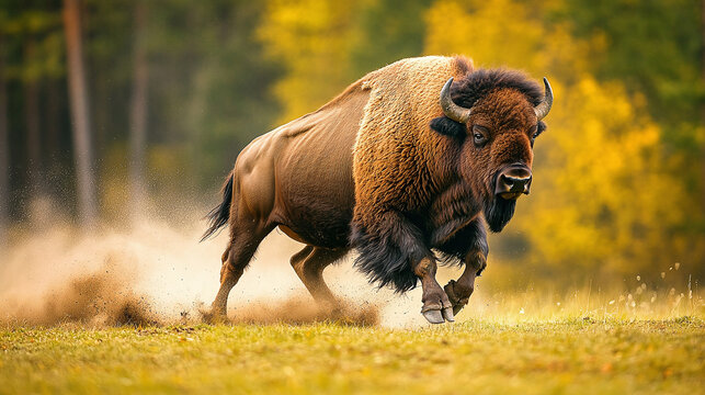 Majestic bison walking through autumn meadow