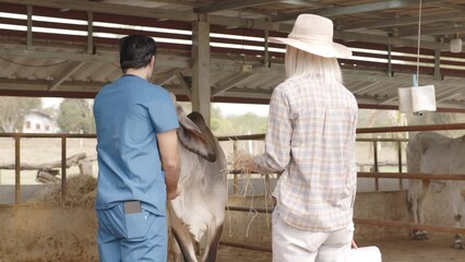 Farm worker feeding the Brahman cows in the cattle stable. beef cattle breeding business. Mammal health care