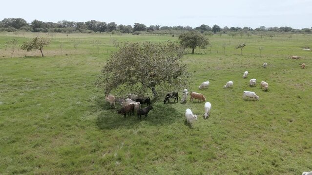 Aerial overhead shot of American Brahman cattle herd on pen farm on summer morning - stock video