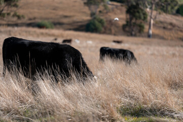 Cows in a field, Stud Beef bulls, cow and cattle grazing on grass in a field, in Australia. breeds include speckle park, murray grey, angus, brangus and wagyu, foot and mouth in bali at sunset