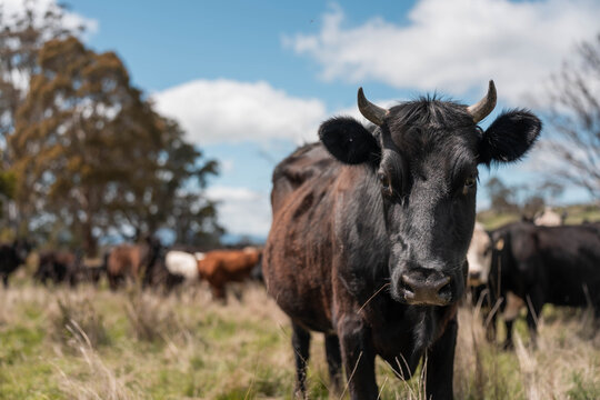 beautiful cattle in Australia  eating grass, grazing on pasture. Herd of cows free range beef being regenerative raised on an agricultural farm. Sustainable farming of food crops. Cow in field
