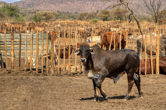 herd of cattle in the pen, Brahman, african bush cattle post kraal , industrial livestock meat production