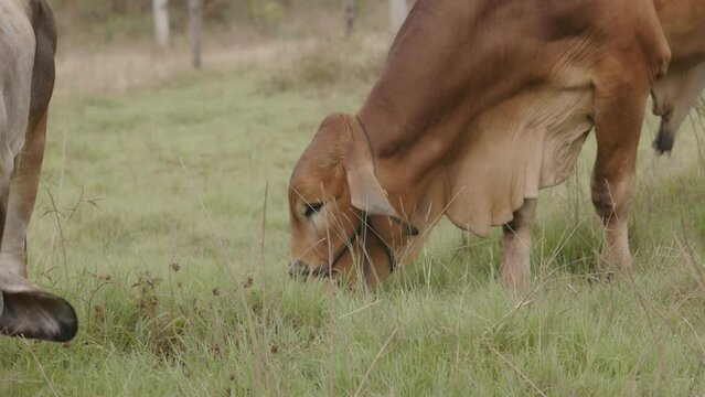 Brahman Cattle Farming Industry in Asia.Cows are eating grass in the open farm.