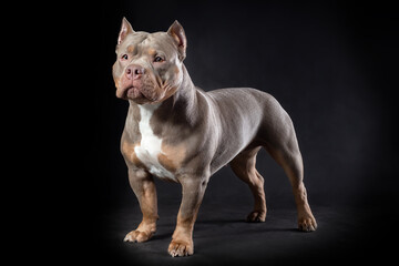 Female dog of american bully breed of lilac tri color standing at the black background