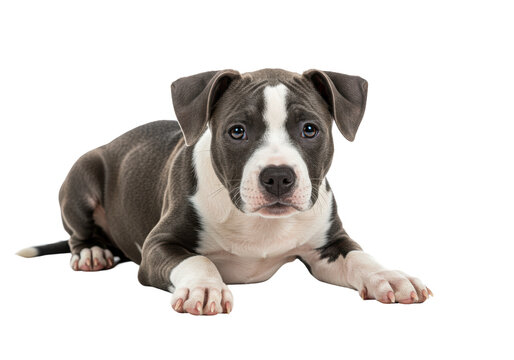 Isolated Adorable American Bully Puppy Lying Down, Sweet Gaze