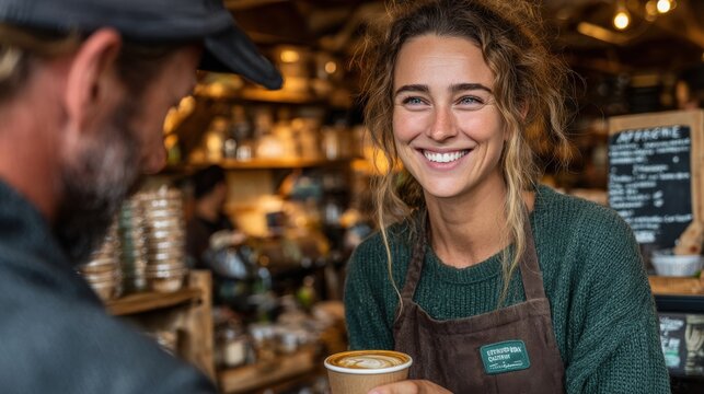 Barista smiling behind counter offering cup of coffee at modern cafe