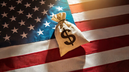 Money bag with dollar sign on the background of the US flag. American economy concept. Investment and success