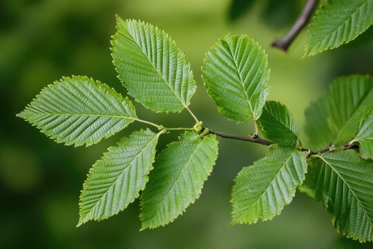 Ulmus Americana. Macro Close-up of Green Leaves on Stem of American Elm Tree