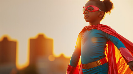 Young boy, kid in a superhero costume, standing confidently, vibrant colors. Concept: child in a hero cape showing confidence, strength, imagination, dreams and skills.