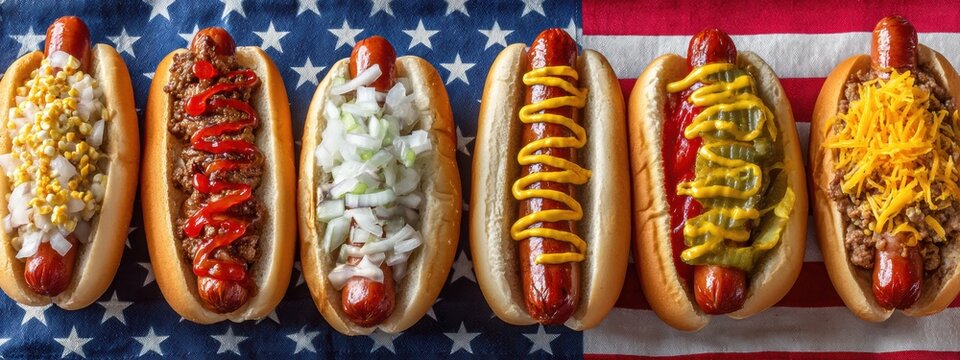 Classic American hot dogs served in soft buns, topped with festive patriotic garnishes, resting on a checkered tablecloth. lively party ,Independence Day street food celebrations.