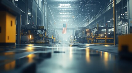 American flag hangs in a deserted, dimly lit industrial factory at night, with machinery lining the sides and a wet floor reflecting the lights, creating a somber and patriotic atmosphere