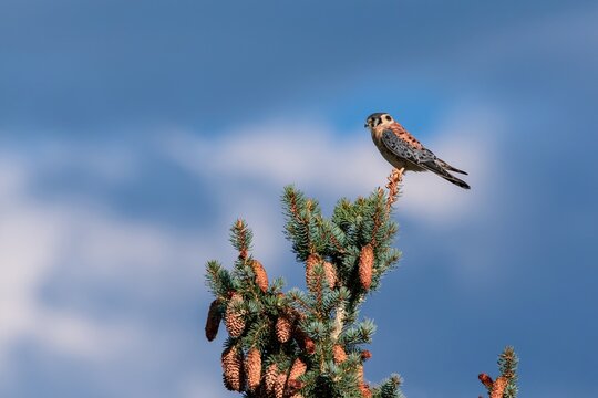 Portrait of an American Kestrel atop a Blue Spruce tree filled with pine cones, framed by an ominous, yet beautiful changing sky.