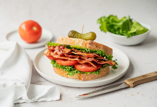 Freshly made BLT sandwich on plate on white background.