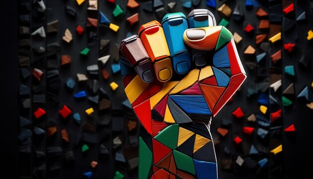 a dynamic mosaic of a raised fist made of colored geometric pieces symbolizing unity and solidarity for black history month and african american heritage