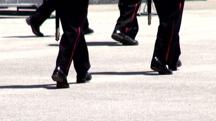Section of soldiers legs in military uniform and boots standing in line at camp, american army