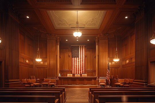 Hyper-Realistic Wide-Angle Photo of a Wood-Paneled Courtroom with High Ceiling and Chandelier