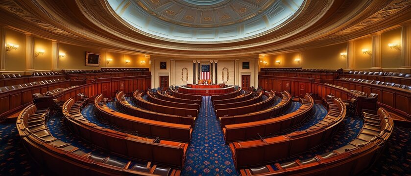 Capture a high-angle view of the Senate chamber, highlighting the ornate architecture and rows of seats in oil painting style