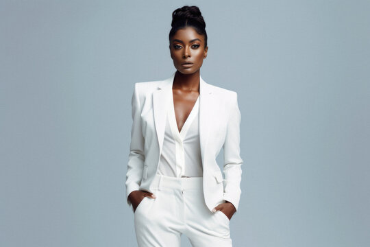 Fashionable african american woman in white suit posing on grey background