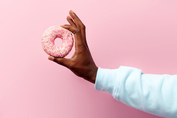 african man's hand holds sweet round donut on pink isolated background, the guy's hand advertises fast food