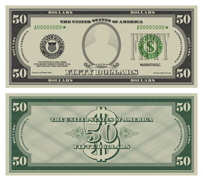 Fifty dollars banknote. Gray obverse and green reverse fictional US paper money in style of vintage american cash.  Frame with guilloche mesh and bank seals. Grant