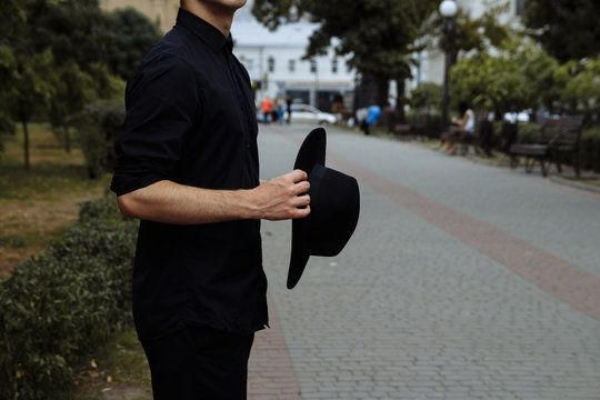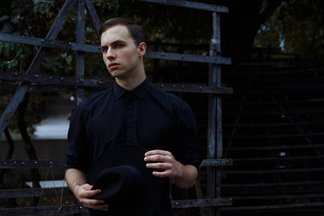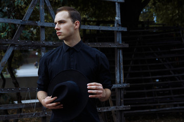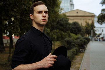 You are welcome concept. Cheerful mature man in blue shirt and cowboy hat gesturing welcome sign