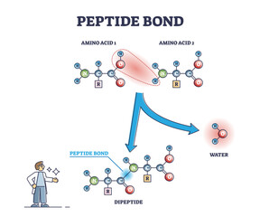 Peptide bond as amino acids formation in protein biosynthesis reaction outline diagram, transparent background. Labeled educational biochemical process explanation with dipeptide.