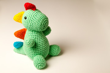 Crochet from the yarn with amigurumi dolls. Background photo. Soft toy, knitting hook, balls of yarn.