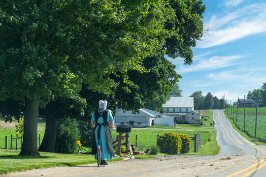 Amish woman on a kickbike or footbike on a rural road surrouned by trees, farms and agricultural fields in the Lancaster area, PA, USA