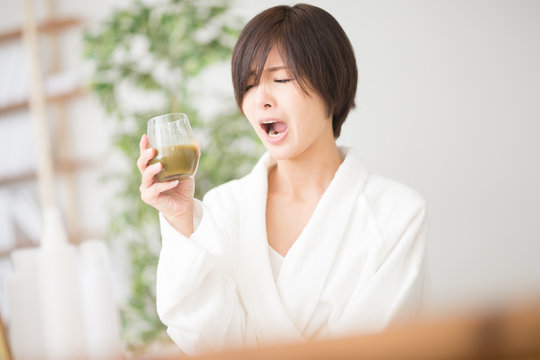 青汁を飲むシニア夫婦。苦いまずい表情。