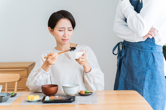 家で食事をする夫婦・カップル(自炊・不満・まずい・モラハラ・夫婦喧嘩・怒る)