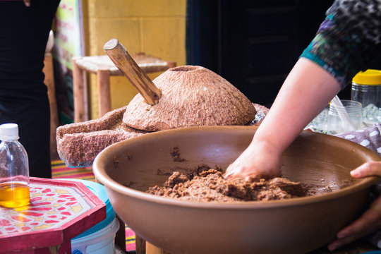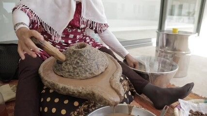 Amlou is made by women using a stone mill to grind almonds, then she add argan oil and honey to form cohesive paste or dip