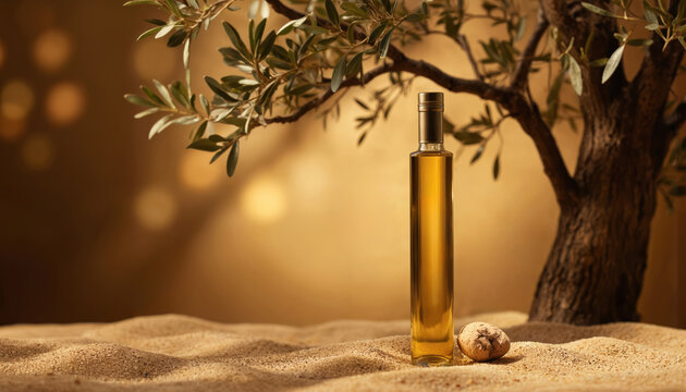 Elegant glass bottle filled with golden argan oil rests on a sandy surface beside an argan tree. Soft bokeh background enhances the luxurious, natural, and organic of this premium product.