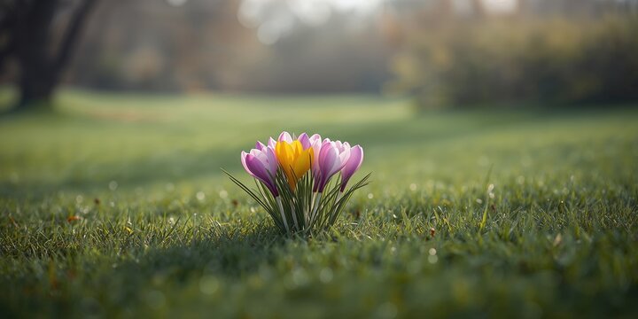 Vivid purple crocus blooming among grass, highlighting seasonal transition, Earth Day