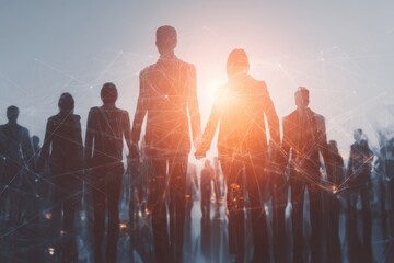 Collaboration among professionals in human resources management showcasing teamwork at a corporate event in a modern office environment at sunset