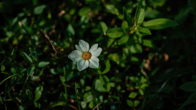 A single white flower with a yellow center among green foliage.