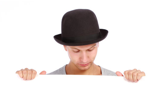 teenage boy hiding behind a billboard and making amotional face
