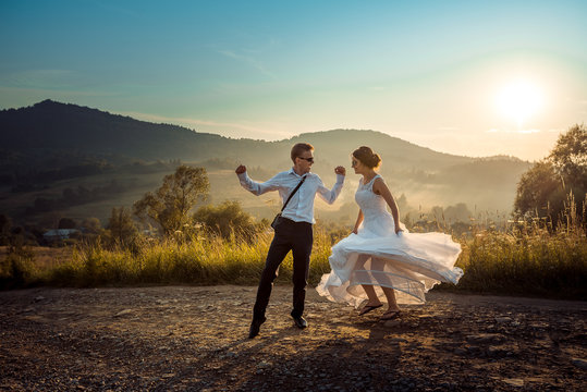 Attractive happy newlyweds are having fun while dancing on the road in the countryside during the sunset.