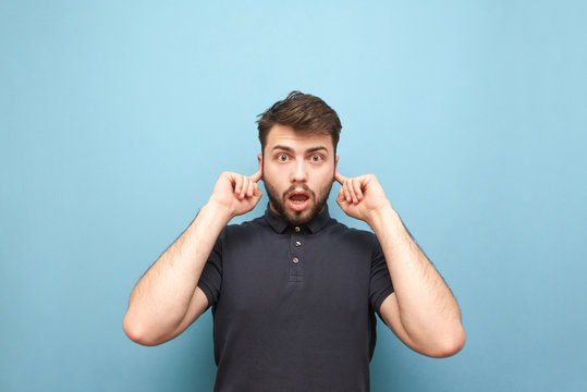 Amotional man with a surprised face closes his ears with his fingers and looks at the camera, isolated on a blue background. Man closes his ears, he does not want to hear
