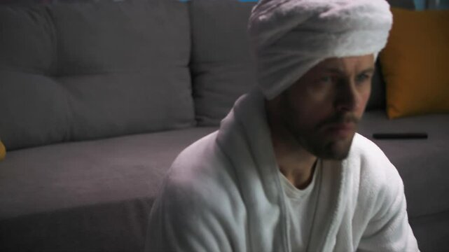 Huge amotional reaction of a man in a white coat with a bowl of popcorn while watching TV. Close-up shot