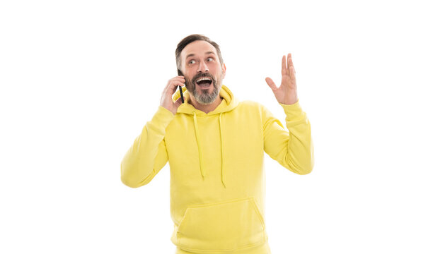 amotional handsome mature man in hoody speaking on phone isolated on white, communication.
