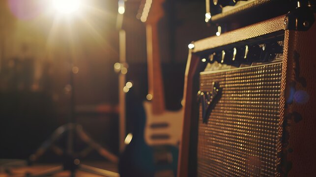 Rock Equipment Icons. Solid, filled icon set of rock music equipment: electric guitar, bass amp, guitar pedal, drumsticks, microphone stand, stage monitor,