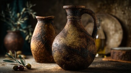 Greek olive oil amphora styled on Japanese stone table, rustic backdrop
