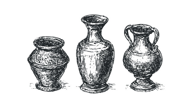 Sketch of three antique amphorae and vases on white. Vector hand drawn illustration