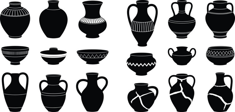 Ancient Pottery Silhouettes Featuring Amphorae, Bowls, and Jars with Decorative Patterns and Reconstructed Vessel Design