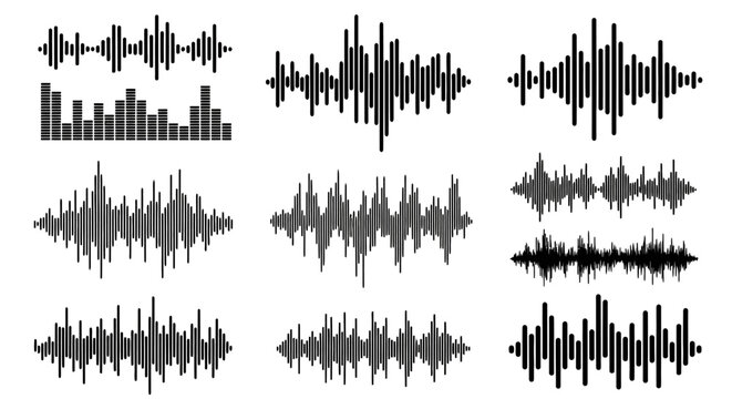Nine graphic representations of sound waves, showing varying amplitudes and frequencies on a white background.