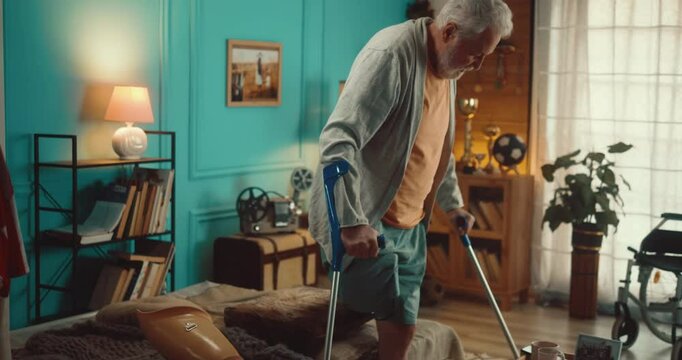 Elderly 70s man with an amputated leg with crutches slowly sits on the bed in his room