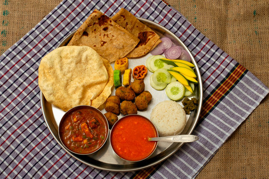 Authentic Maharashtrian lunch thali with Amras and poli, India.